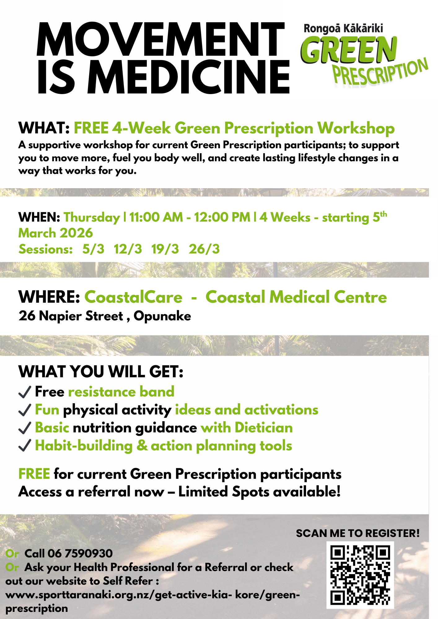 Complete a Green Prescription self-referral form (see below link and button) or ask your doctor, practice nurse or health care professional for a Green Prescription. Otherwise, contact us on (06) 7590930 or 0800 (ACTIVE) 22 84 83