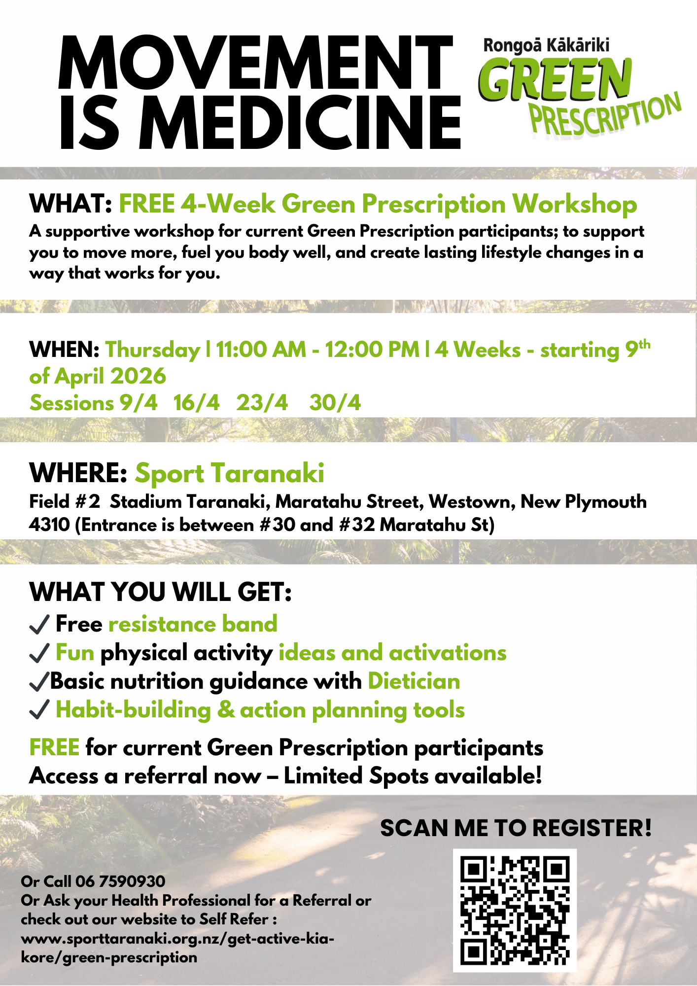 By agreeing to proceed with your Green Prescription, you consent to Sport Taranaki sharing information with the Te Whatu Ora Taranaki and the Ministry of Health. Information shared will be for statistical purposes only and individuals will not be identifiable. Sport Taranaki will comply with the Privacy Act 2020, Health Information Privacy Code 2020 and Health (Retention of Health Information) Regulation 1996. If you have any questions or concerns please discuss these with your GRx Advisor. Sport Taranaki acknowledges the Code of Health and Disability Service Consumer Rights. For more information visit www.hdc.org.nz